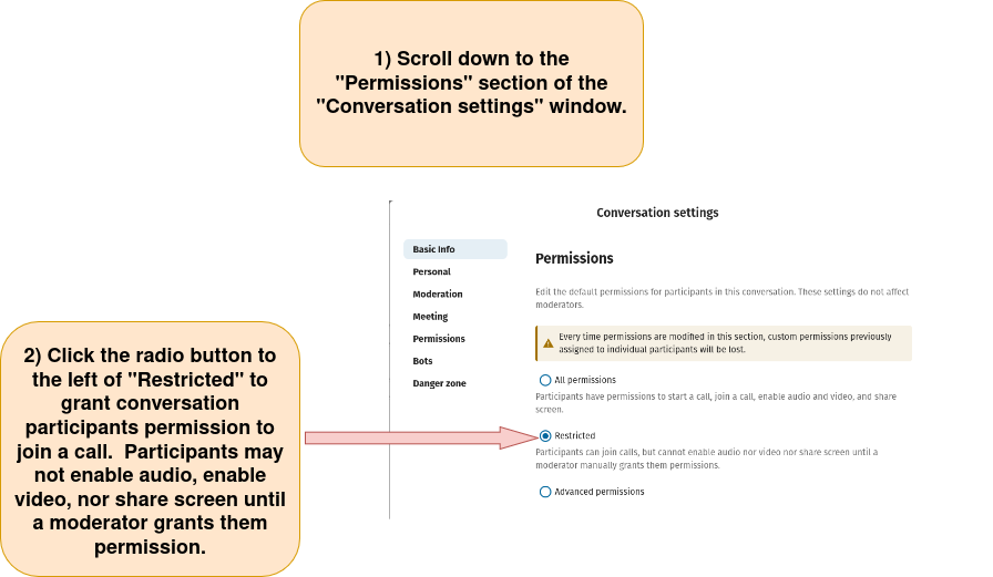 4) Assign “Restricted” as the default permission for participants in a Nextcloud Talk Conversation.
