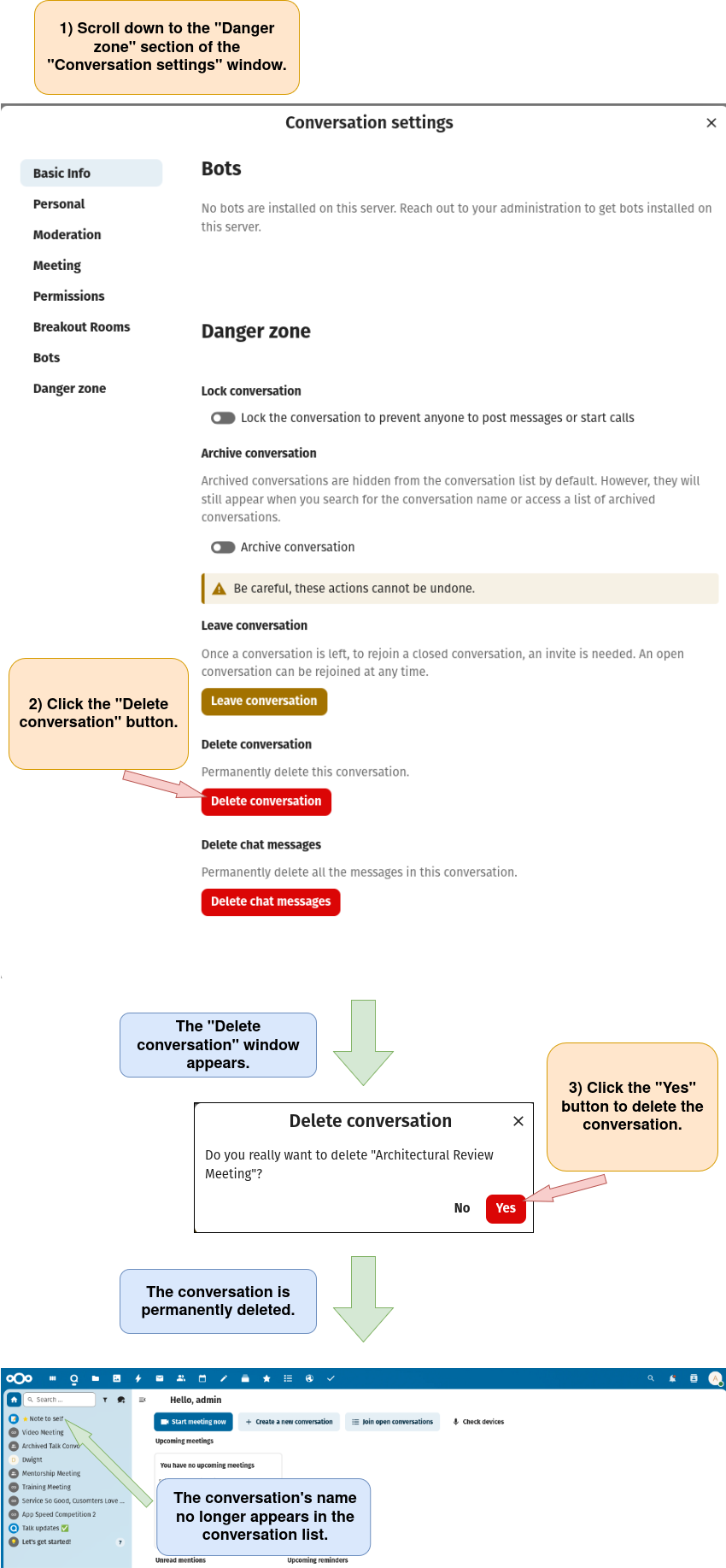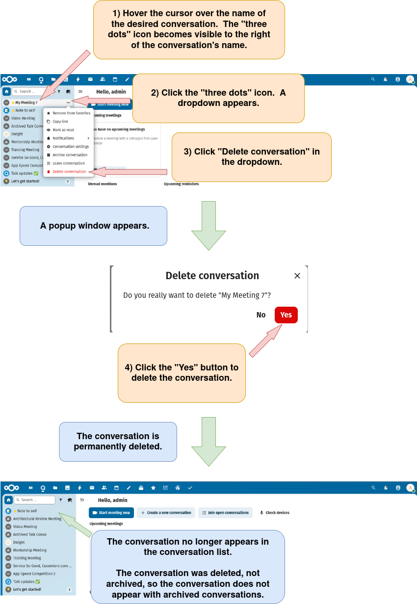 There are two options that can be used to delete a Nextcloud Talk conversation.