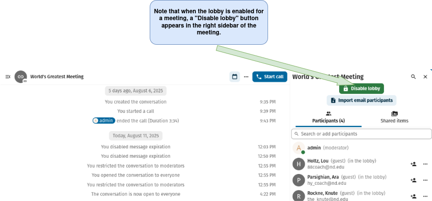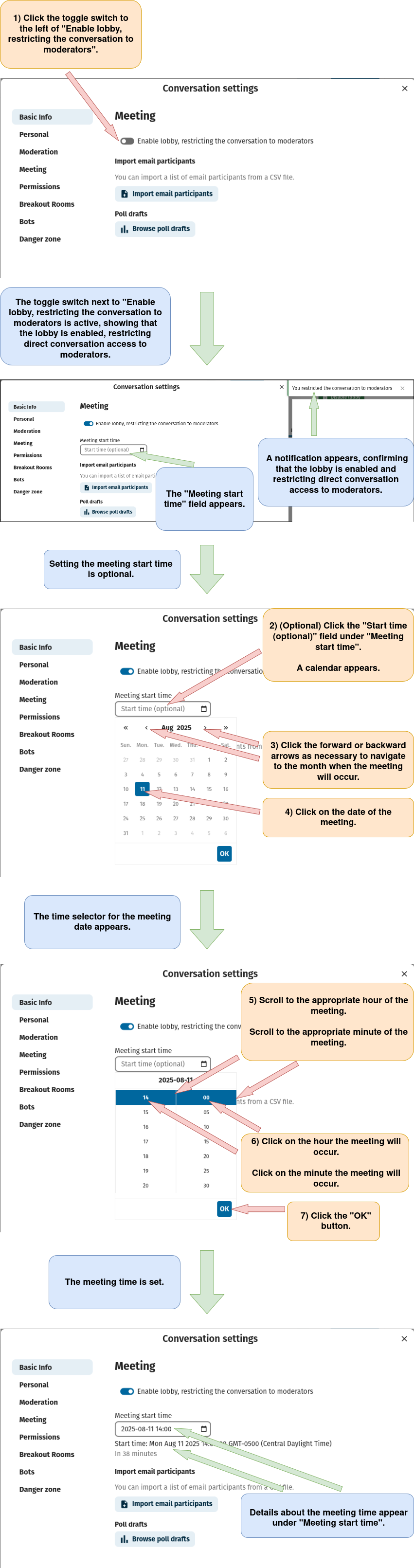 4) Enable the meeting lobby and restrict access to the conversation to moderators. Optionally, set the meeting start time.