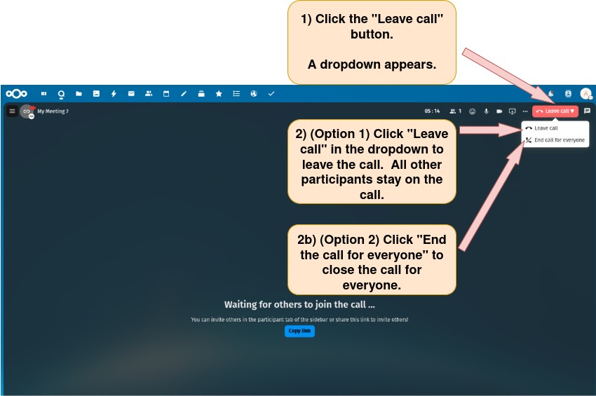 Note: These instructions are for leaving a Nextcloud video meeting. For instructions on how to leave a Nextcloud chat conversation click here.