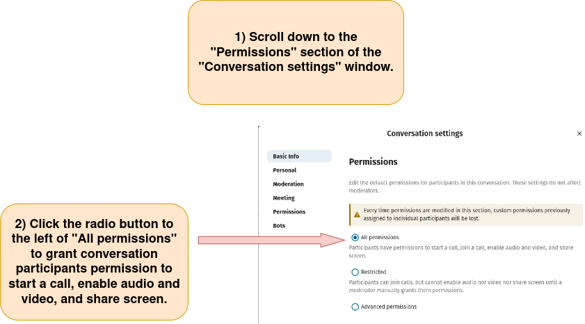 4) Assign “All permissions” as the default permission for participants in a Nextcloud Talk Conversation