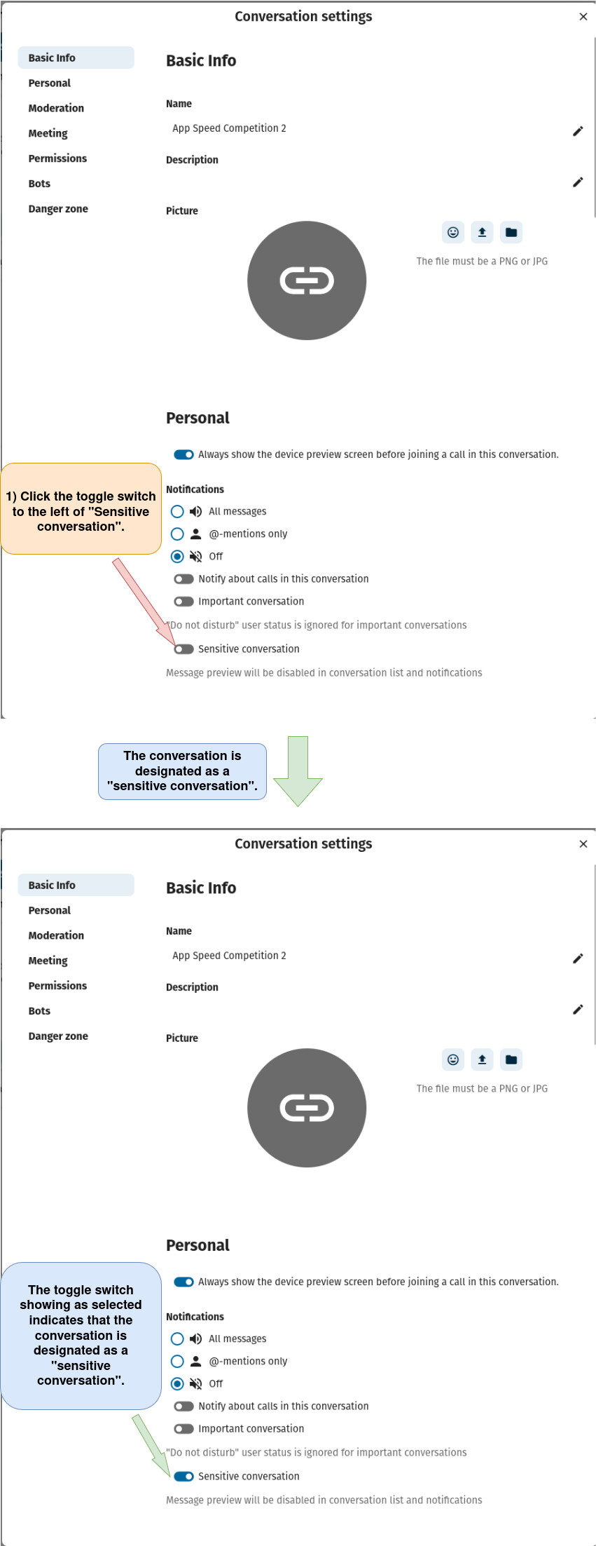 Note: When a Nextcloud Talk conversation is set as “sensitive”, it means that the most recent message will not appear under the conversation’s name in the conversation list and that notifications for the meeting are generalized (they do not show who caused the notification or a message in the notification).