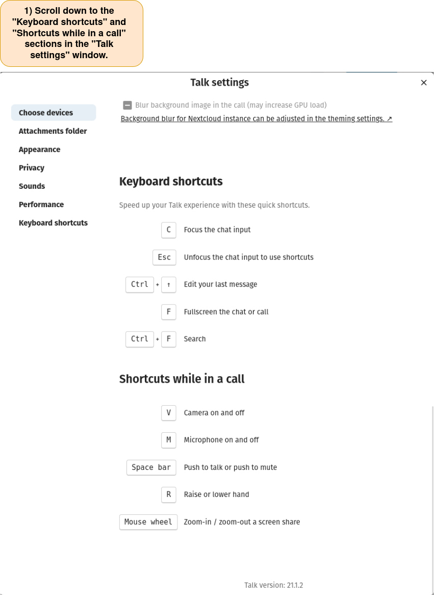 4) View Nextcloud Talk “Keyboard shortcuts” and “Shortcuts while in a call”.